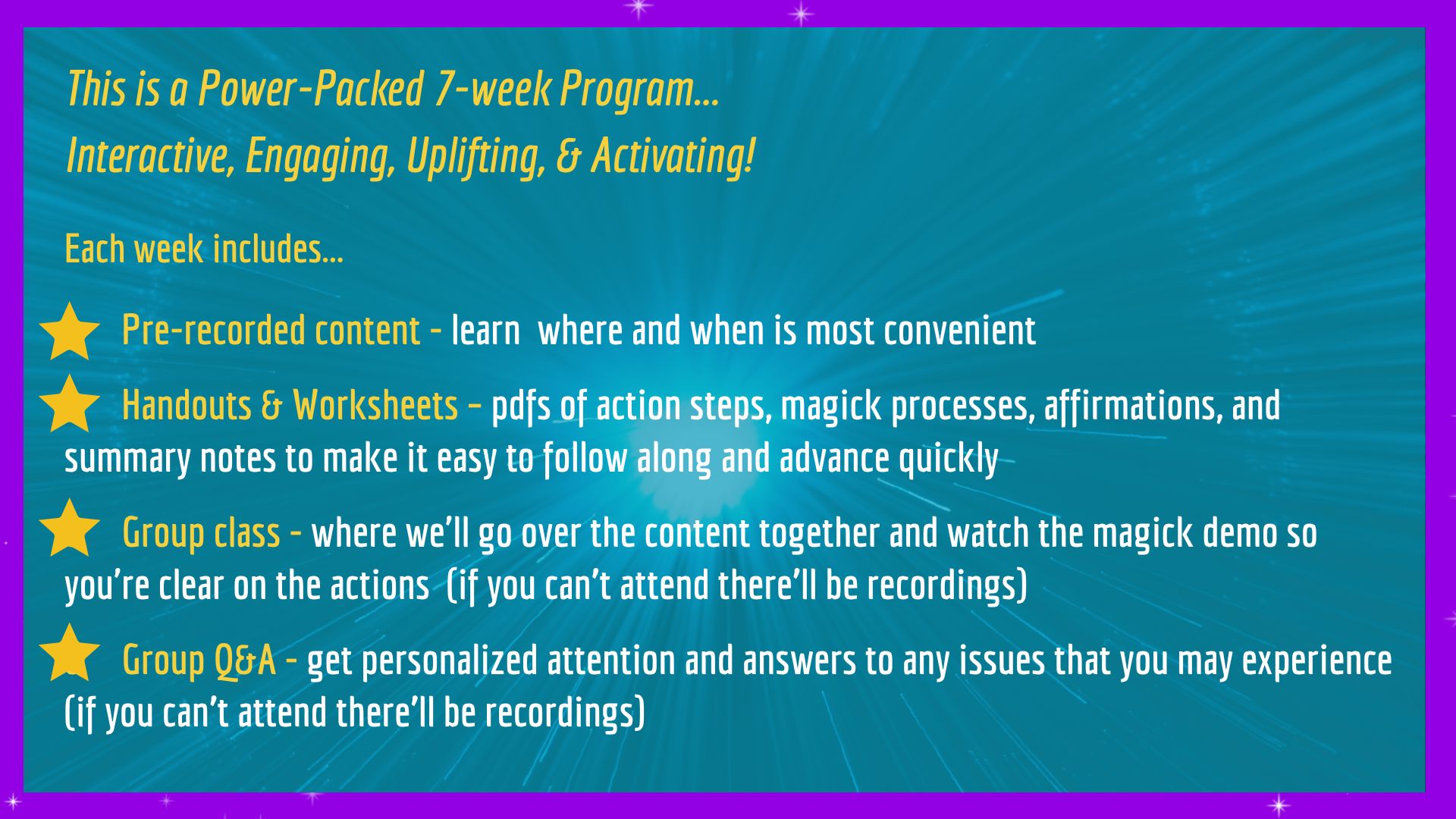In this revolutionary program, I will not only help you figure out how (and why) to break through what’s been holding you back from the impact, success, and financial reward you’ve been striving for... but give you the confidence and the MAGICKAL TOOLS you need to make your dreams a reality.
