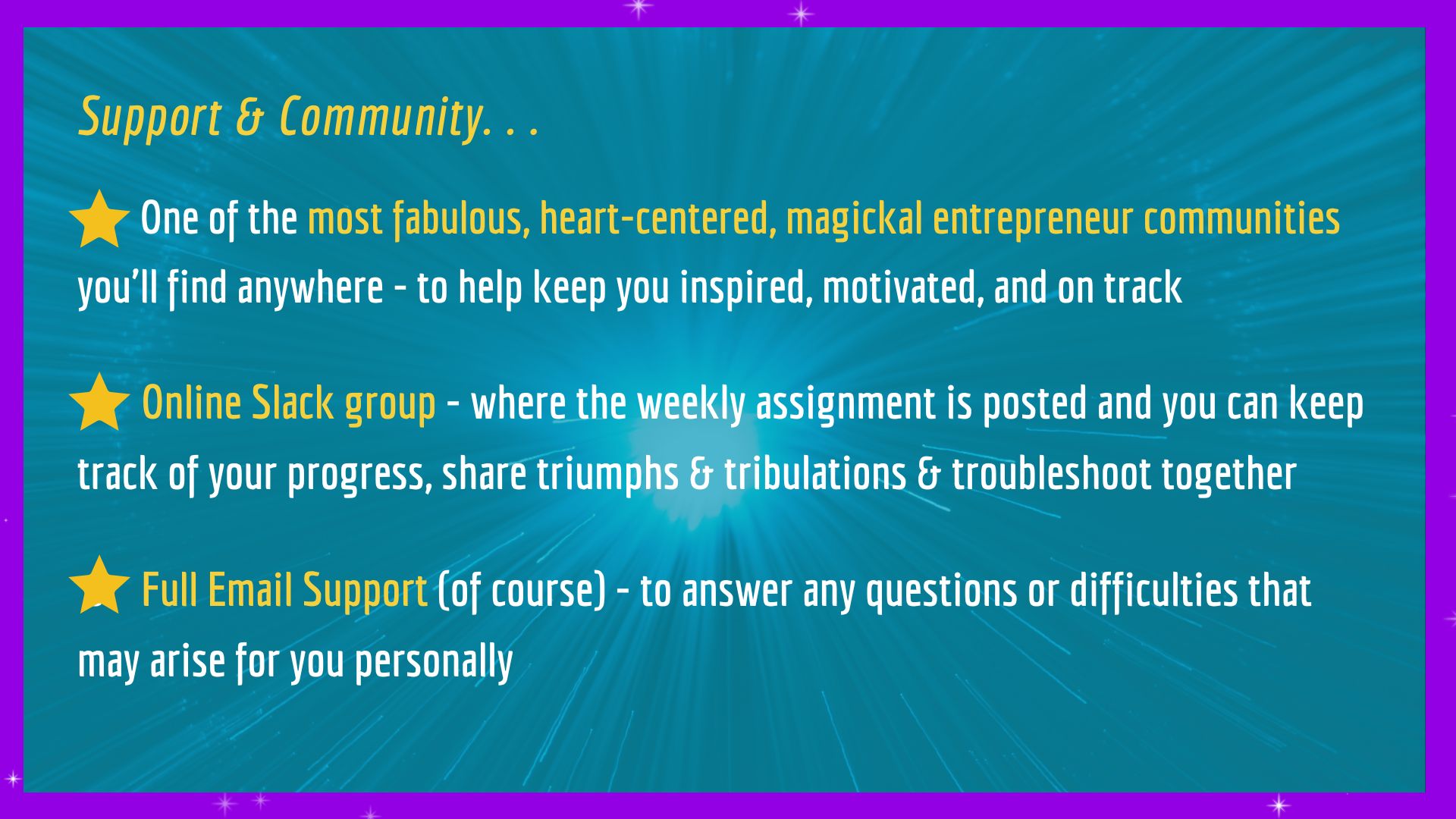 • Participate in one of the most fabulous, heart-centered, magickal entrepreneur communities you'll find anywhere!