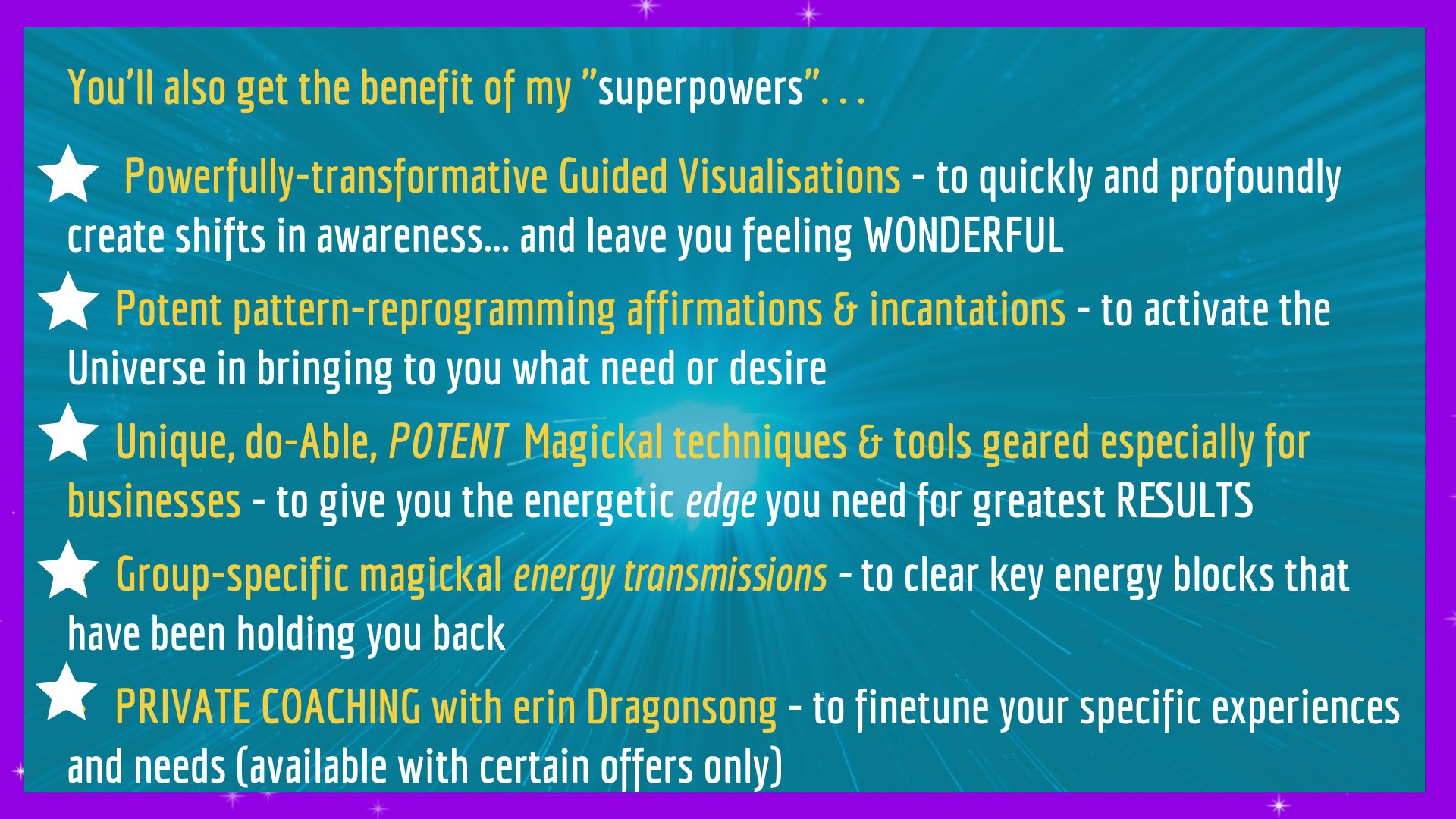 • Group-specific magickal energy transmissions, to clear key energy blocks that have been holding you back